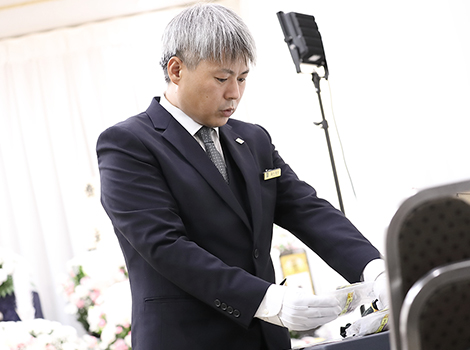 佐藤は一級葬祭ディレクター、その仕事は最初のご相談から、ご遺体のケア、葬儀当日の司会進行までと多肢に渡るという。