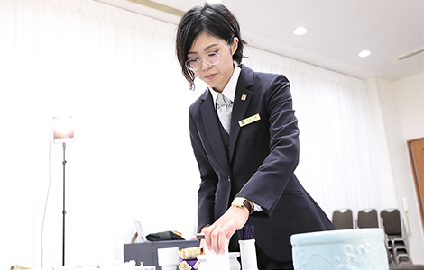 特に訃報直後は動揺されているご遺族も多く、お話をお聞きしていく際に、ゆっくりと丁寧に対応する事を心がけているという。 「葬儀に何人くらい呼びたいのか、菩提寺があるのか、などさえお教えいただければ、私共から様々なご提案をさせていただきます。葬儀場選びはもちろんのこと、どのような式にしたいのか、またお出しするお料理や返礼品をどうするのかまで、故人やご遺族のご希望にできる限りお応えしていきます」。